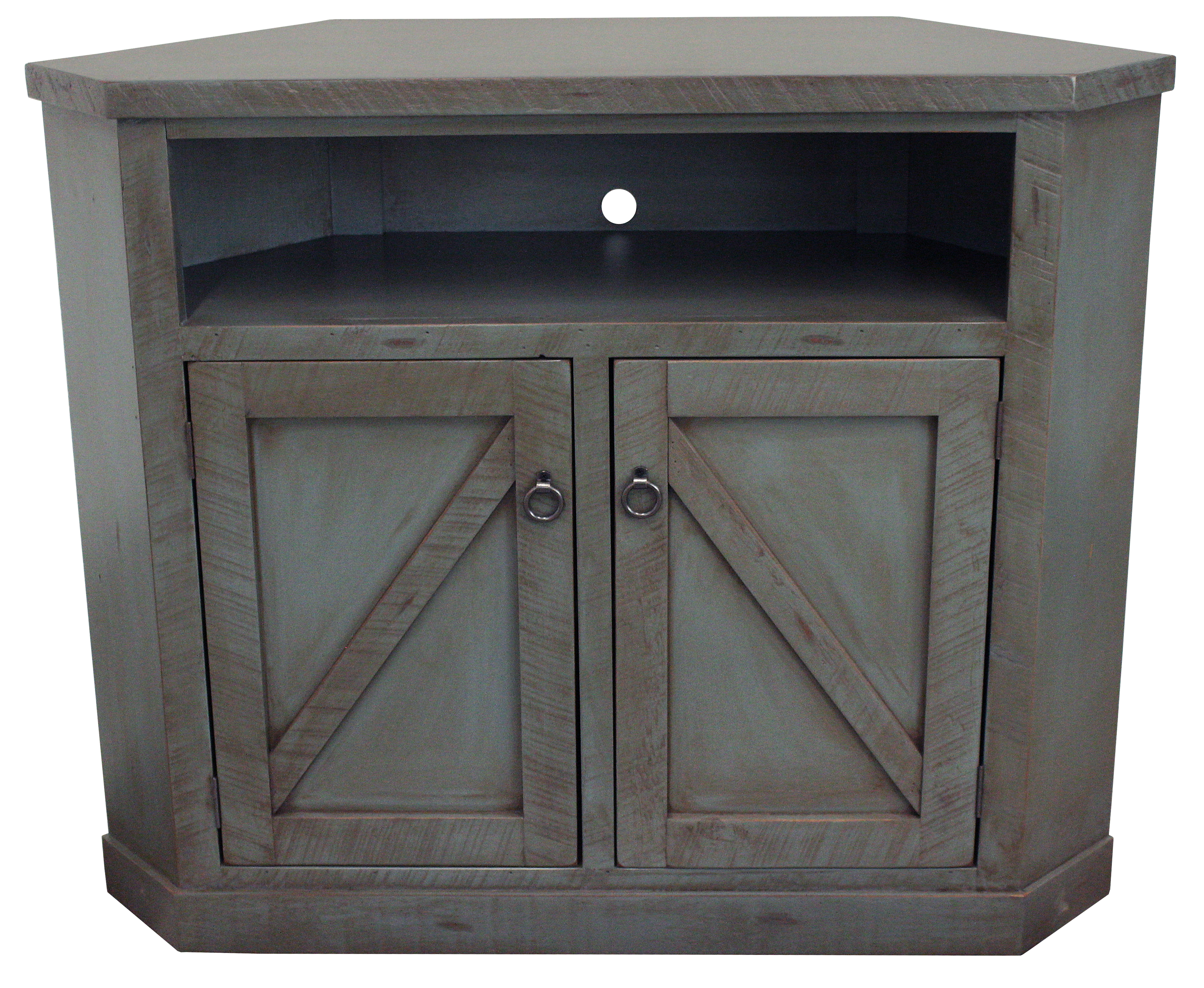 The Rustic Dark Blue TV Stand features 2 doors with hidden interior shelves. Fits a 35" soundbar inside.Read More