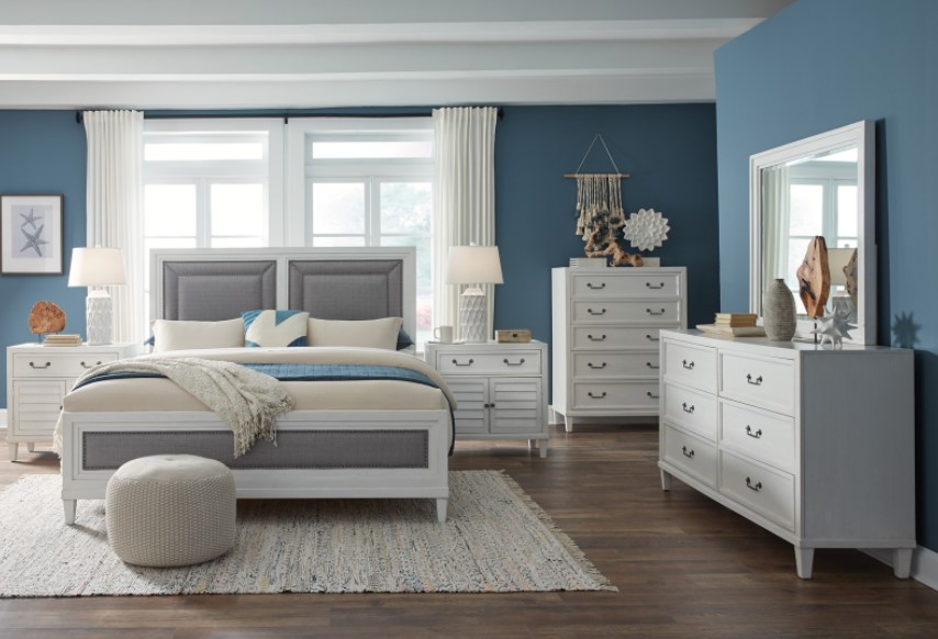 Complete your bedroom design ideas with this 4 Pieces Bedroom set from 1210 Dunescape collection. Shown in gray finish. This set includes queen panel bed, dresser, nightstand and a mirror. This set will definitely add style to your room.Read More