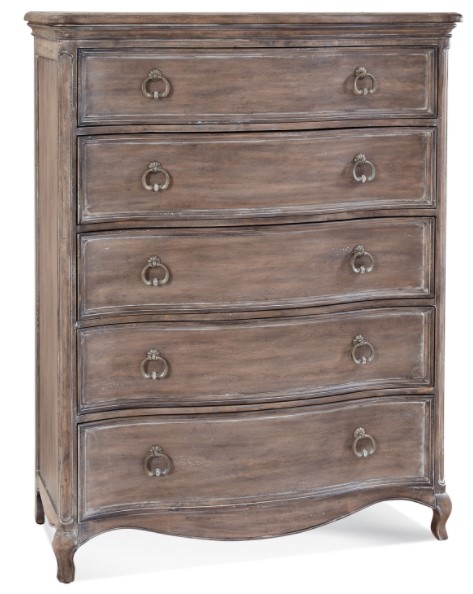 Inspired by timeless French antiques, the Genoa master bedroom collection exudes grace and style with sculptured wave-shaped fronts on case pieces, cabriole legs, curved aprons on case bases and a shaped headboard and mirror with carving detail. Crafted of Hardwoods and Mahogany Veneers, Genoa is offered in a Taupey Grey finish with Dove White Hang-up that allows the natural wood aesthetic to show through, with light distressing such as rough sewn marks and worm holes. The sophisticated finish is complemented by Antique Pewter bale pull hardware with Dove White hang up. Floral back plates add elegance to the bale-pull hardware.