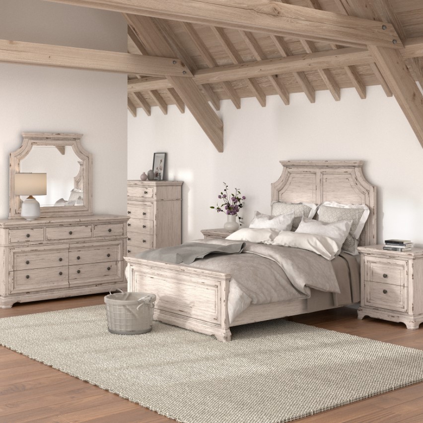 Crafted of mahogany solids and MDF veneers this 1910 Providence 4 Pieces Bedroom Set provides cottage and traditional style to your room. The pieces include the beautiful bed in Queen and King sizes, the mirror, dresser and 3 bedside options: a night table, 3-drawer nightstand.Read More