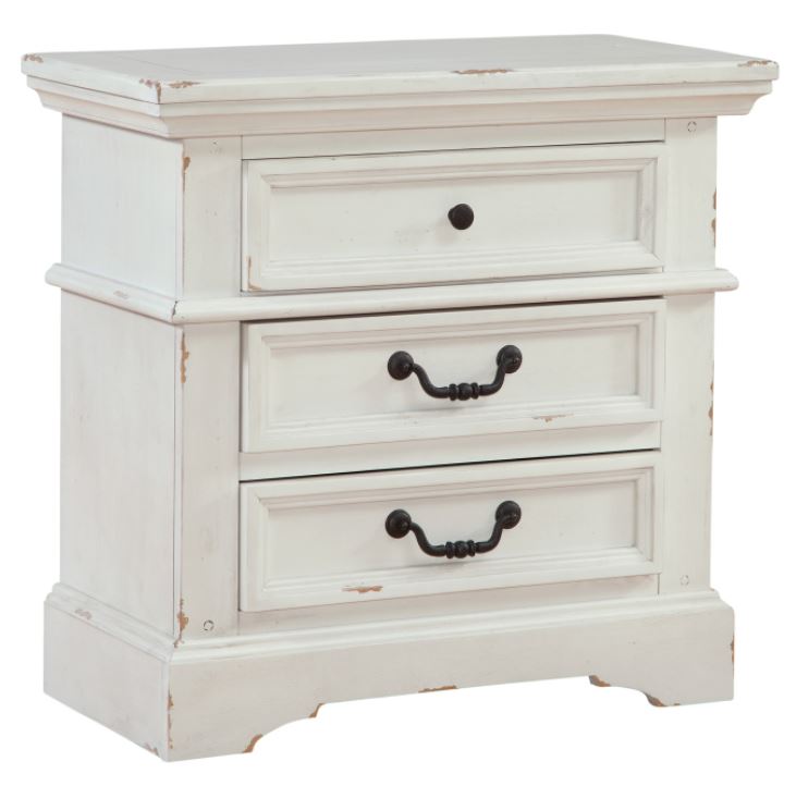 Peg detailing on the top of the cases and headboard creates a craftsmanship appeal. Offered in a distressed Antique White finish over Mahogany veneers with hammered knob and bale-pull hardware, the Stonebrook collection has a multitude of sleep options and bed silhouettes. Options include a Queen and King panel bed and twin and full panel bed, along with a twin-over-twin and twin-over-full bunk bed with an optional trundle unit. Case pieces include a dresser, mirror, 3-drawer nightstand, chest, door chest, double dresser, vertical mirror, 2-Drawer nightstand, and 4-Drawer chest. All drawers have quality English dovetail joinery in front and back and finished interiors.