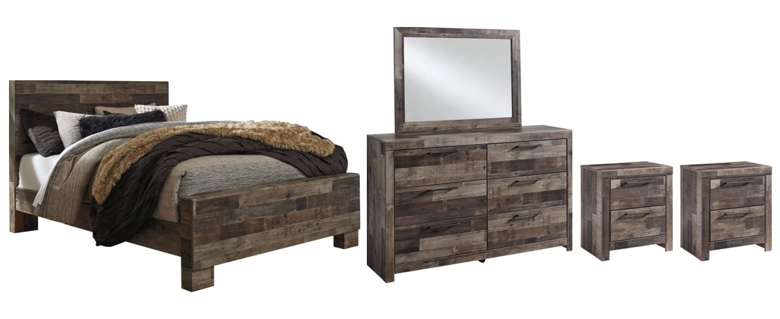 Includes panel bed (headboard, footboard and rails), 6-drawer dresser with mirror, and two 2-drawer nightstands