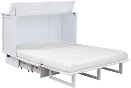 A queen-size bed easily pulls out with a three leg mechanism and the cut-out handle on its recessed base.