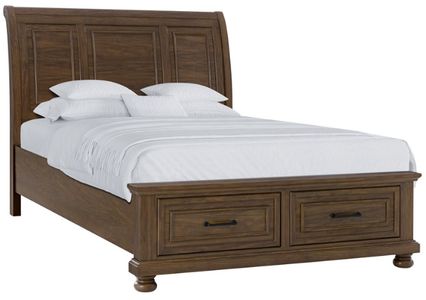 The sleigh headboard offers a graceful silhouette while the footboard includes two spacious storage drawers for practical everyday use