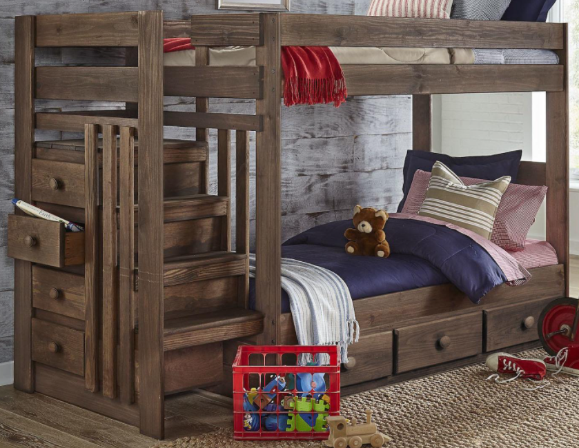 The 6989 Chestnut Bunkbed features wood material, twin size on both beds and ladders with storage drawers to access top bed. Bottom bed also features 3 drawers for storage.Read More