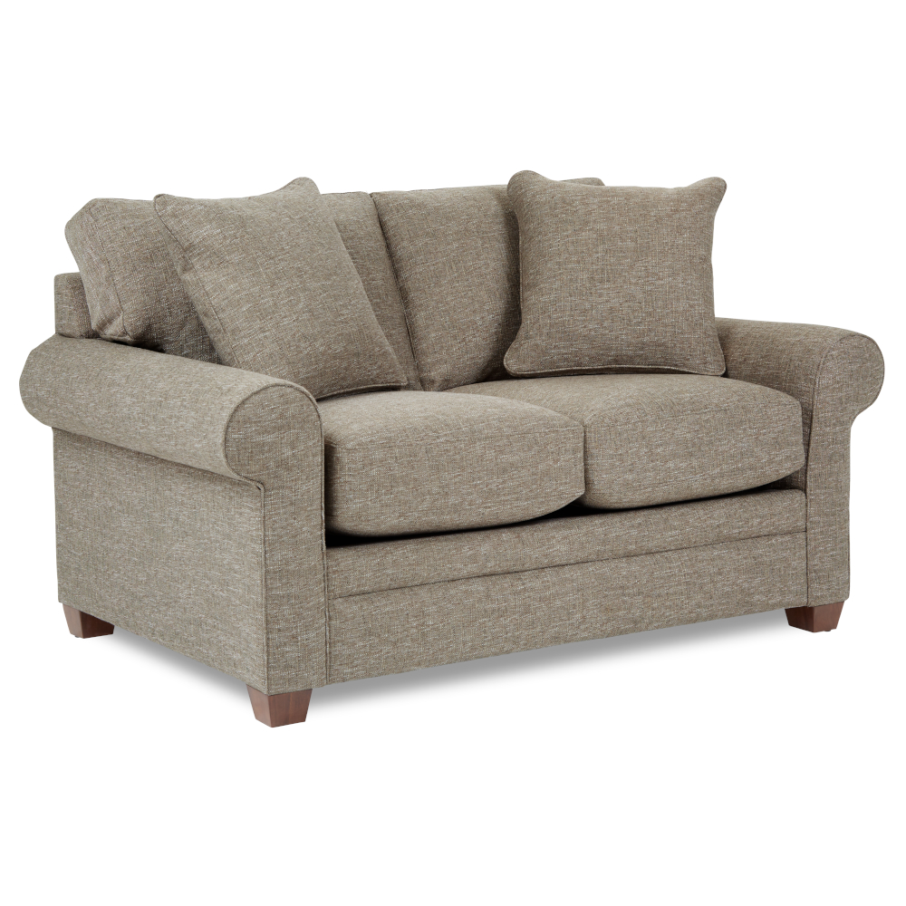 The Olson is a traditional and casual sofa for any room. A combination of soft seating, roll arms, and decorative wood legs give it a classic, understated style that blends easily with any decor. Patented ComfortCore® cushions provide just the right amount of support for a long or short sit. Make it yours with your choice of fabrics and other available upgrades. Includes two accent pillows. A matching ottoman is available separately.