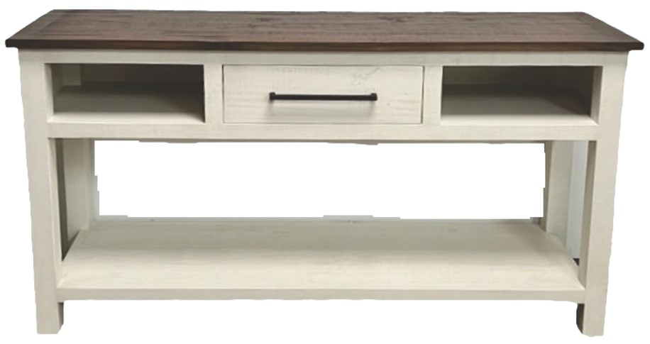 The Million Dollar Rustic Frosted White Sofa Table offers a rustic frosted white finish, one drawer for storage, and three fixed shelves for displaying decor or storing essentials. Its functional design and charming style make it a perfect addition to any living room or entryway.Read More