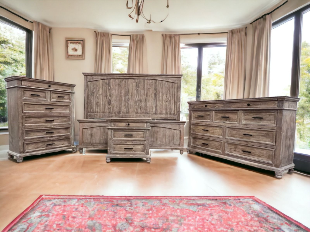 This group is a functional and stylish set that adds warmth and character to any bedroom. Great storage in the dresser, chest and night stand with wonderful rustic styling with an added touch of elegance and sophistication. Set includes dresser, chest, night stand and king size bed.Read More