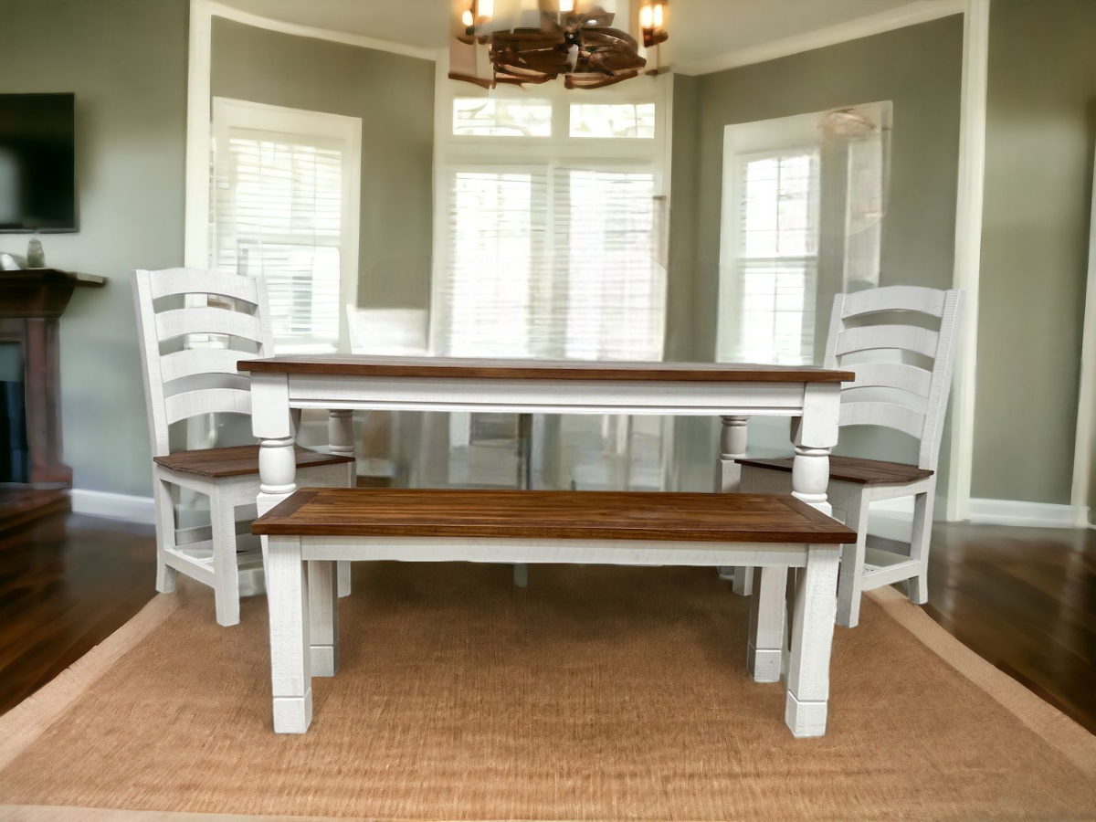 The two tone Willow group from Million Dollar Rustic features a frost white and warm brown finish. Sure to compliment most dining areas with plenty of seating for the family. Complete with four ladder back chairs and a 4' bench.Read More