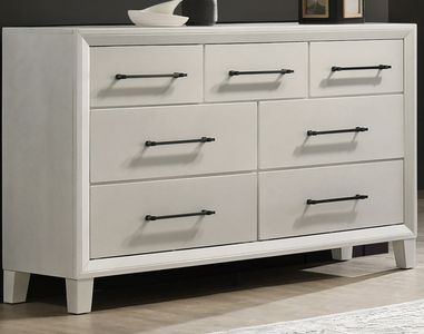 The Ballard 7-drawer dresser features a white finish and sleek silhouette, crafted from solid rubberwood, engineered wood, and okume veneers for lasting strength. Picture frame moldings, tapered legs, and square metal pulls offer timeless transitional style.Read More