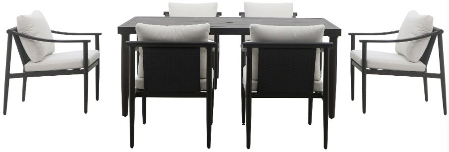 The Moana patio dining table and side chairs combine style and durability. The aluminum table with a powder coat finish resists scratches and weather, seating six comfortably. The wicker chairs feature fade-resistant sundura™ cushions for comfort and elegance in any outdoor setting.Read More