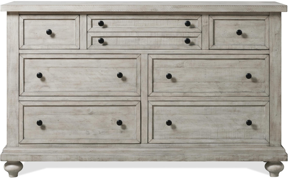 Featuring a cottage-style design, the Riverside Furniture Hailey Pebble 7-Drawer Dresser is constructed of solid Pine with a soft gray Pebble finish. Two bottom drawers have Cedar veneer bottoms, all others are felt-lined.Read More