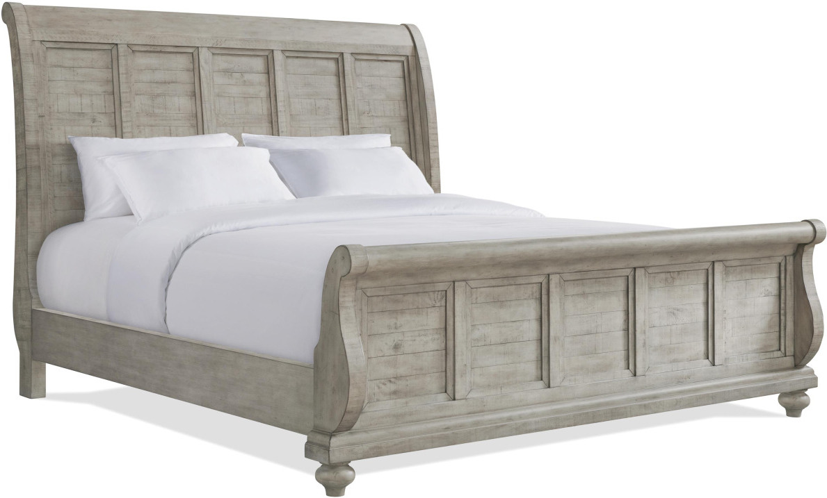 Featuring a cottage-style design and classic sleigh shape, the Riverside Furniture Hailey Queen Sleigh Bed is constructed of solid Pine with a soft gray Pebble finish and natural woodgrain details.Read More