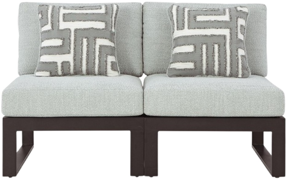 Sleek, contemporary style meets outdoor living in this sectional. Its clean-lined black aluminum frame and resin wicker back expertly balance good looks and longevity. The enhanced UV resistance of Nuvella+™ fabric keeps the cushions light and bright, weathering the seasons beautifully.Read More