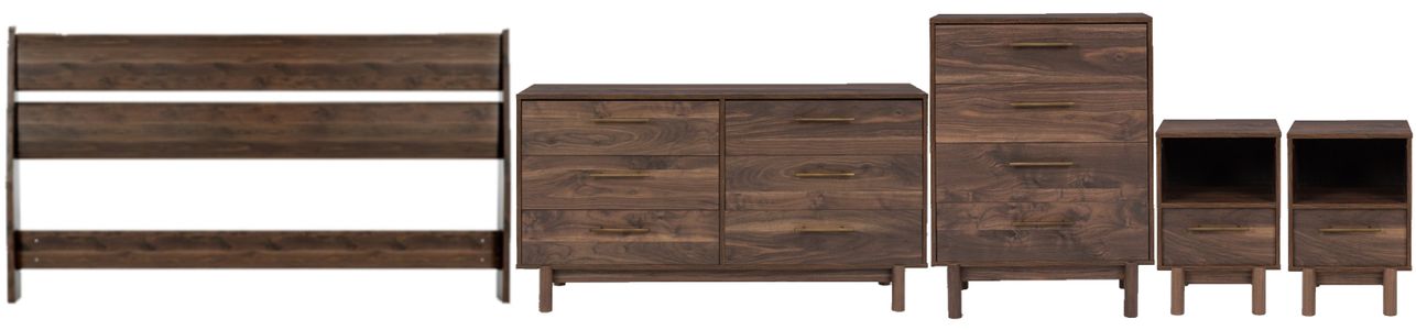 Includes queen panel headboard (does not include bed frame), 6-drawer dresser, 4-drawer chest and two 1-drawer nightstands