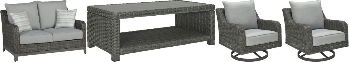 Add a distinguished touch of gray to your outdoor living space with this loveseat with table and chairs package. It's made with resin wicker over an aluminum frame for a relaxed look that provides seasons of enjoyment. Rest assured, the thick seat and back cushions are wrapped in our exclusive Nuvella® high-performance fabric that’s fade-resistant, stain-resistant and a breeze to clean.Read More