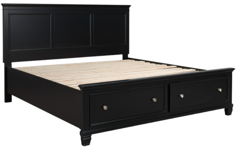 Includes panel headboard, storage footboard with roll slats and rails