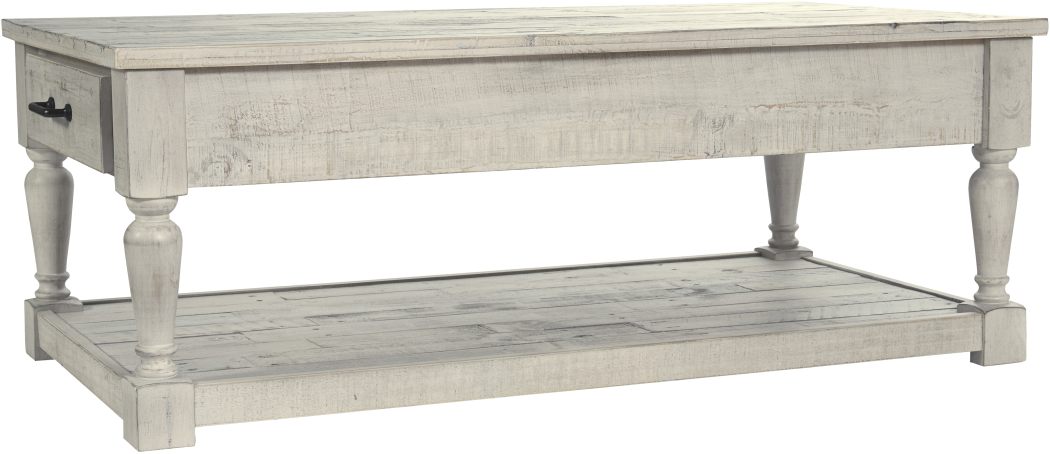 The Shawnalore coffee features 2 smooth-gliding drawers, an open lower shelf, and a distressed whitewash finish over a planked build.